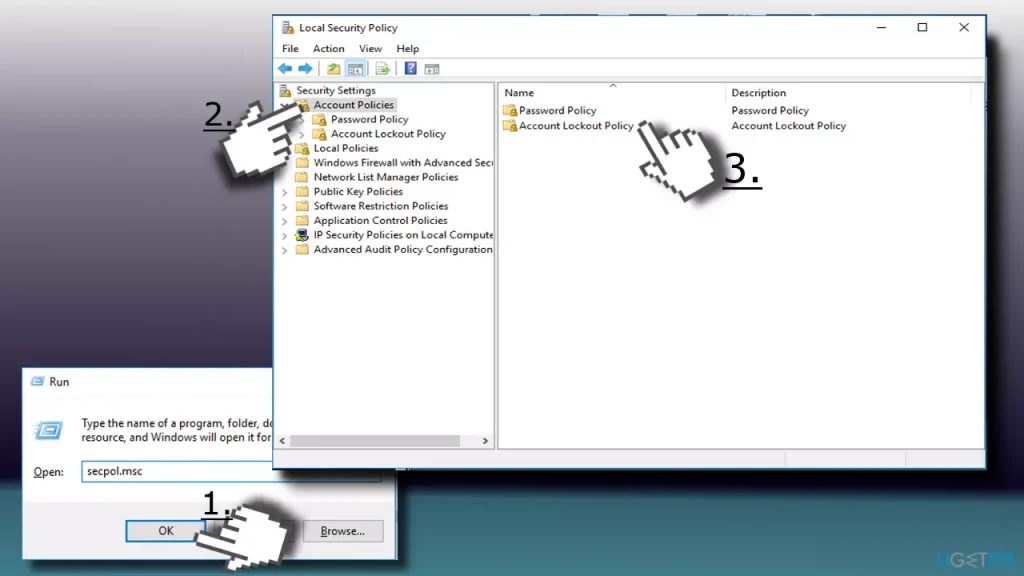 • Press Windows key + R, type secpol.msc, and hit Enter.
